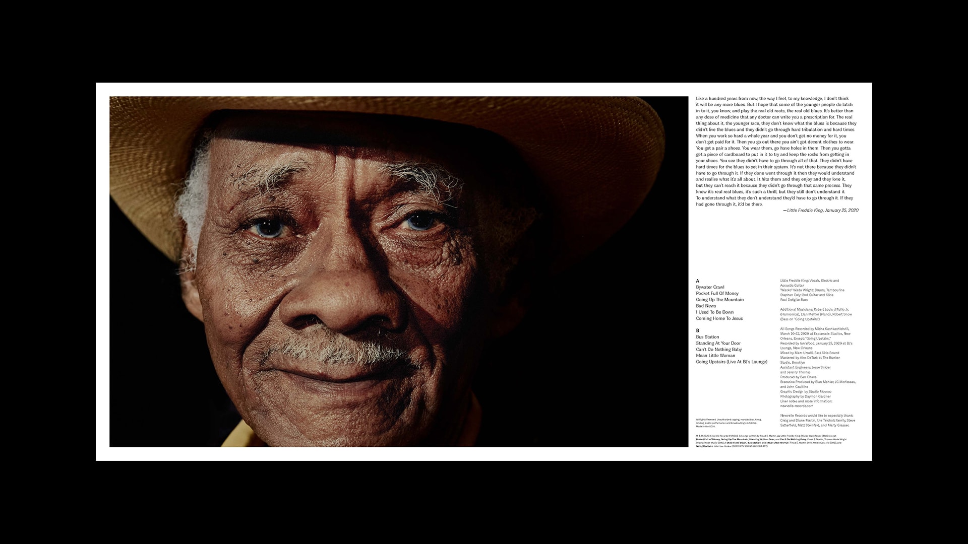 This vinyl box set features new recordings from New Orleans greats Irma Thomas, Little Freddie King, Jon Cleary, and Ellis Marsalis. The sleeves we designed for the series combine Daymon Gardner’s stunning photography with two typefaces drawn in-house. Each album features an intimate black-and-white portrait, and opens up into a full color gatefold with liner notes from the artist, capturing the vibrancy and soul of the recordings and the city itself.